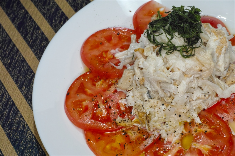 また、トマトの部分はレシピ上何もかけないのですけど今回はおかずとして食べたかったのでオリーブオイルと粗挽き胡椒で味を付けました。