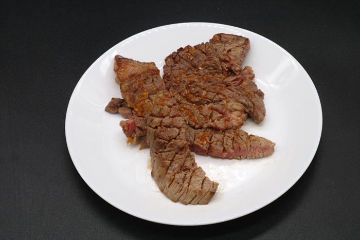 続いて、アメリカンさん牛モモ肉、流石に先ほどと比べると固い印象は有りますが、ステーキサイズにカットしていれば噛み切れないと言う事は無い感じです。