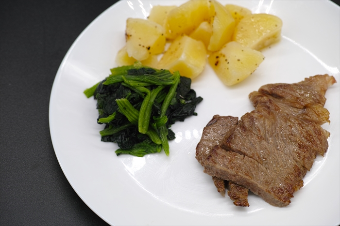 付け合わせに、じゃがばたと冷凍ボイルホウレンソウ(レジチン)で、早速、北海道産の方から食べてみました。