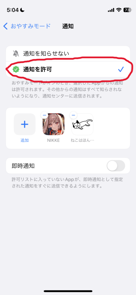 ③赤丸部分をタップし通知許可するアプリだけを選択、連絡先(着信)も同様にする。