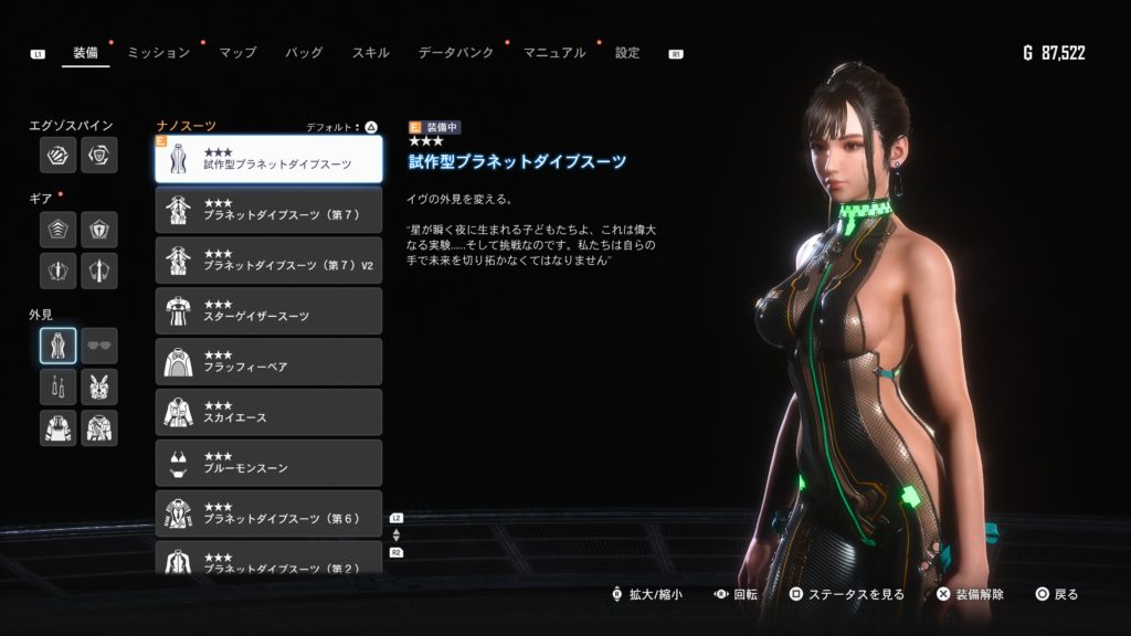 衣装選択時に×ボタンを押す事で、衣装解除となりスキンスーツと言うボディーペインティングな状態で、かなりきわどい見た目になりますが、シールド無し(防御力かなり低下)状態になるので、見た目だけでなく難易度も上げる事が出来るので、アクションゲームが得意な方はスキンスーツでゲームをするのも良いかも知れません。